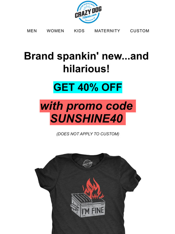 Crazy Dog T-Shirts Coupons & Promo Codes - September 2022 Past Crazy Dog T-Shirts Coupon Codes These Crazy Dog T-Shirts promo codes have expired but may still work. 40% Off code 40% Off Sitewide Click through and tap 'copy & go' to receive 40% off storewide at Crazy Dog T-Shirts. ... A40 Show Coupon Code Expired 09/03/22 40% Off code 40% Off Sitewide